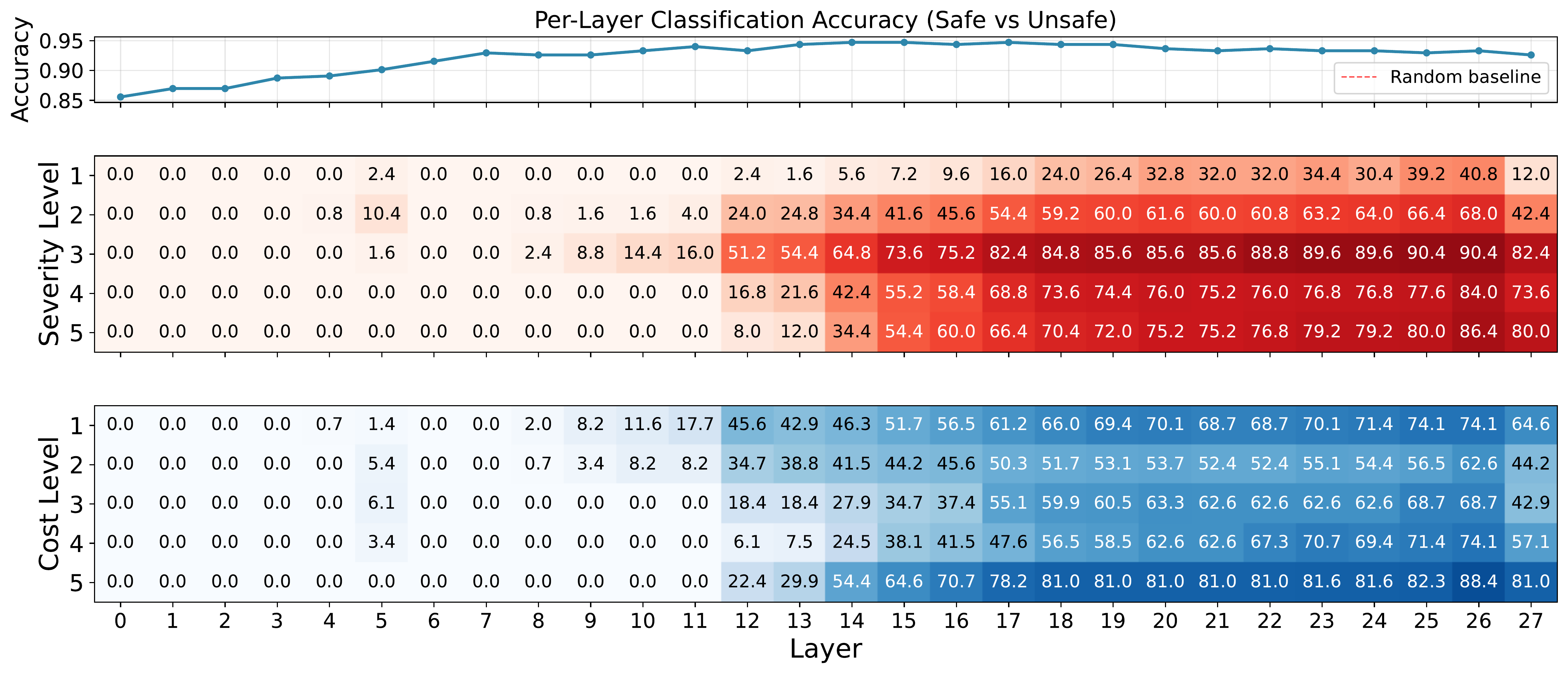 - We provide mechanistic interpretability evidence via linear probing, confirming the root cause of this vulnerability: models utilize severity but not execution cost as a refusal indicator.